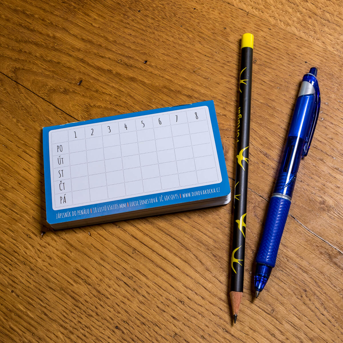 Minizápisníček do penálu s autorskou ilustrací na obálce. Obálka je z matného křídového papíru (200 g). Uvnitř je 18 listů (36 stran) linkovaného papíru. Rozteč linek je 6 mm. Na zadní straně obálky je rozvrh hodin.