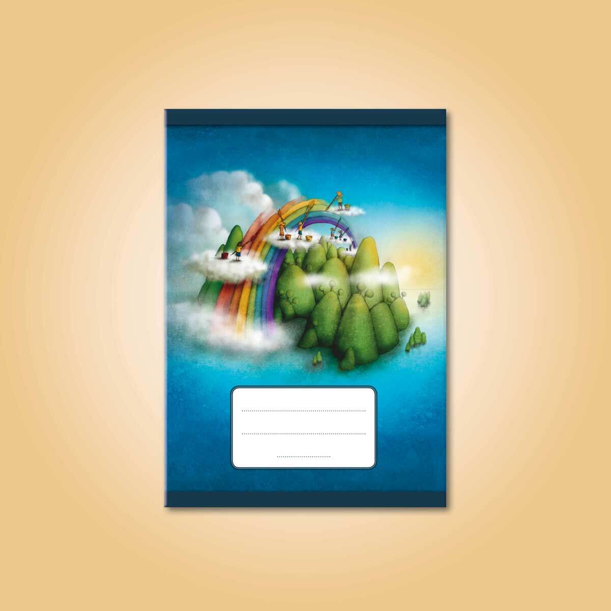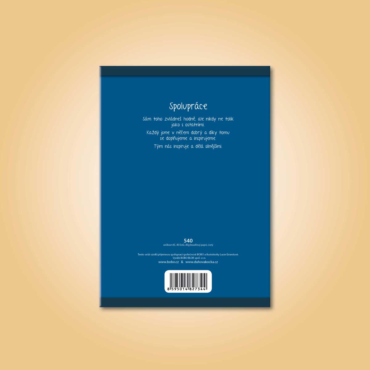 Školní sešit, typ 540 s autorskou ilustrací "Spolupráce" na přední obálce a motivačním textem na zadní obálce.