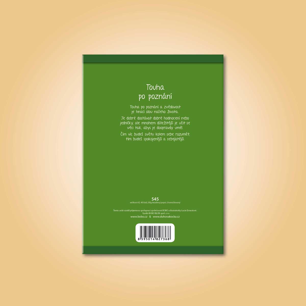 Školní sešit, typ 545 s autorskou ilustrací "Touha po poznání" na přední obálce a motivačním textem na zadní obálce.