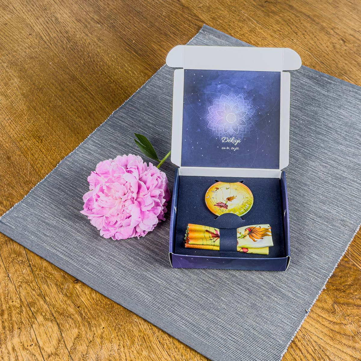 Tato originální dárková krabička obsahuje praktické zrcátko do kabelky s motivem Spokojenost a hadřík na brýle se stejným motivem.