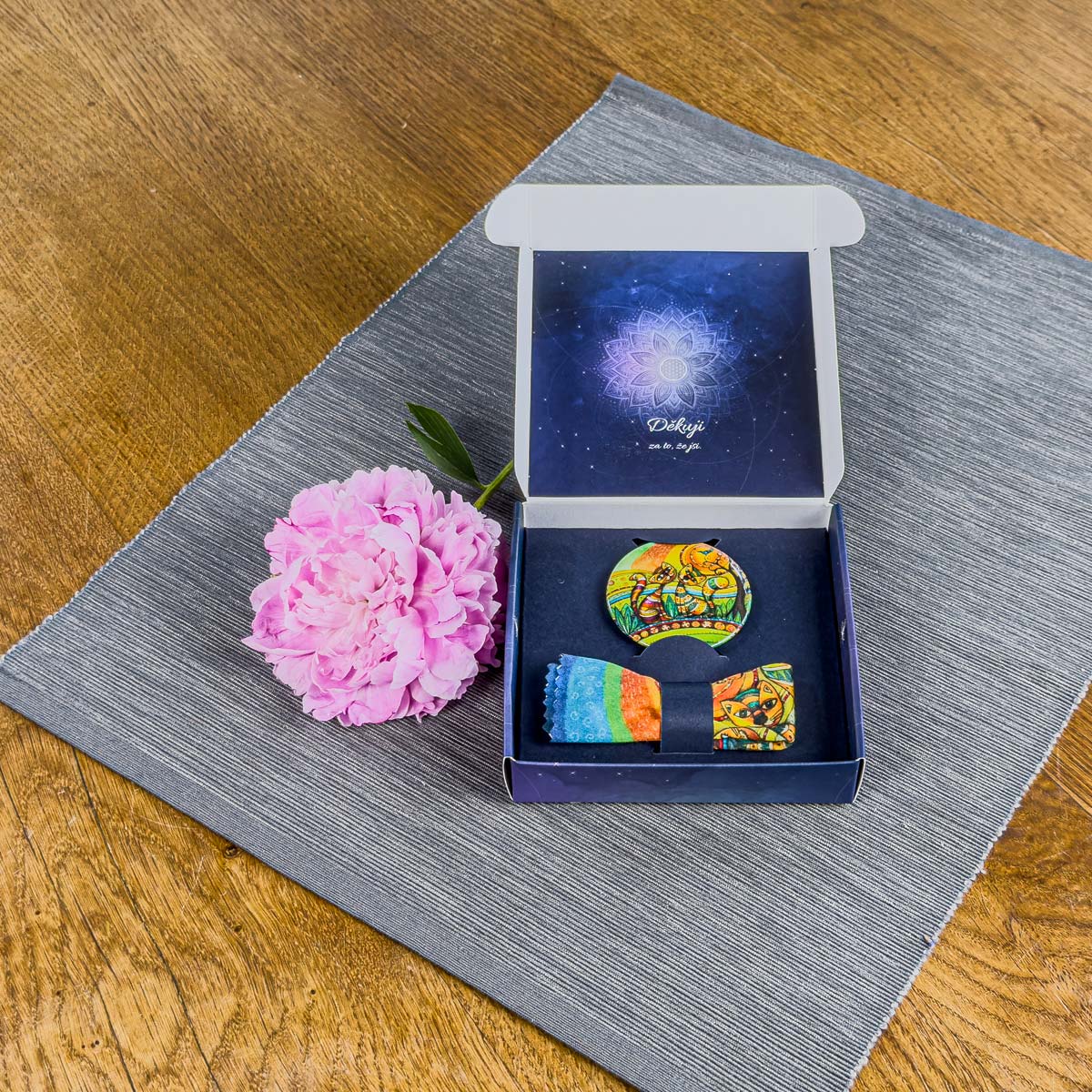 Tato originální dárková krabička obsahuje praktické zrcátko do kabelky s motivem slunečních koček a hadřík na brýle se stejným motivem.