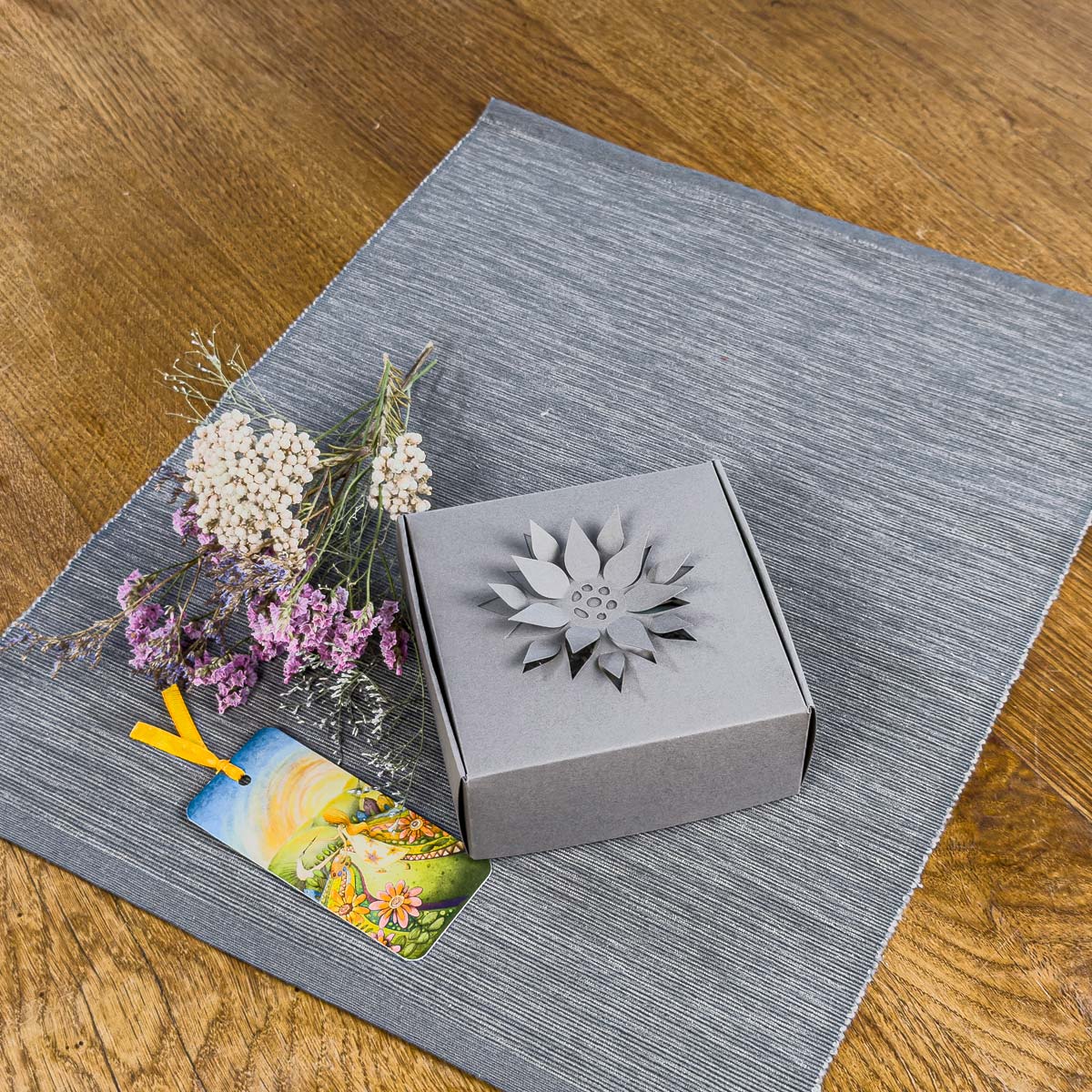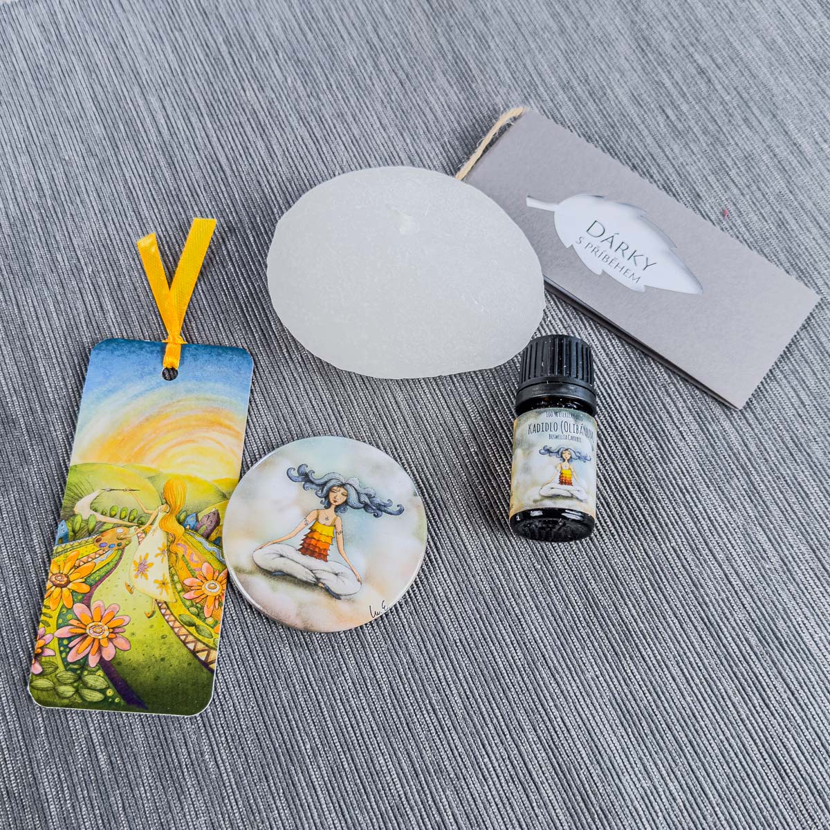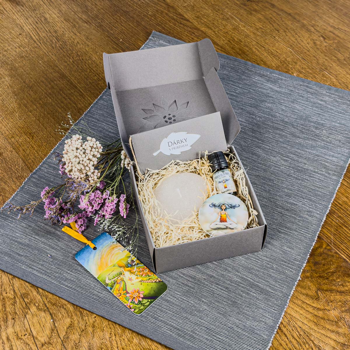 Tato originální dárková krabička obsahuje kvalitní parafínovou svíčku "Svítící kámen" z dílny Ateliéru Via, přírodní esenciální olej Kadidlo z Mydlárny u dvou koček, zrcátko do kabelky s motivem Meditace, praktickou záložku do knížky s autorskou ilustrací a malou brožurku "Dárky s příběhem".