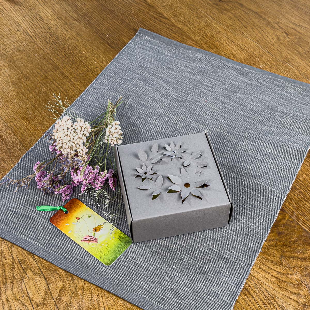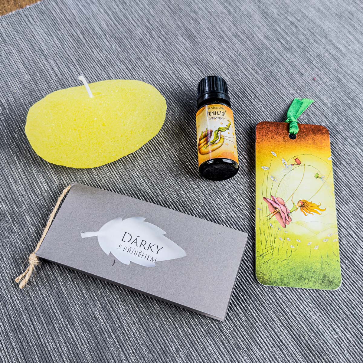 Tato originální dárková krabička obsahuje kvalitní parafínovou svíčku "Svítící kámen" z dílny Ateliéru Via (9 x 6 x 4 cm, 100 g), přírodní esenciální olej Pomeranč (10 ml) z Mydlárny u dvou koček, zrcátko do kabelky s motivem Pomerančová tanečnice, praktickou záložku do knížky s autorskou ilustrací a malou brožurku "Dárky s příběhem".