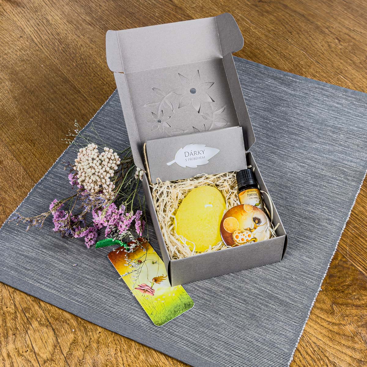 Tato originální dárková krabička obsahuje kvalitní parafínovou svíčku "Svítící kámen" z dílny Ateliéru Via, přírodní esenciální olej Pomeranč z Mydlárny u dvou koček, zrcátko do kabelky s motivem Pomerančová tanečnice, praktickou záložku do knížky s autorskou ilustrací a malou brožurku "Dárky s příběhem".