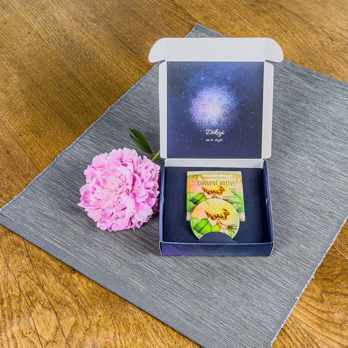 Elegantní a originální papírová krabička tmavomodré barvy s 3D motivem mandaly na vnější straně a s potiskem mandaly na vnitřní straně víka doplněným textem "Děkuji za to, že jsi.". Na dně krabičky je ukryto afirmační poselství.