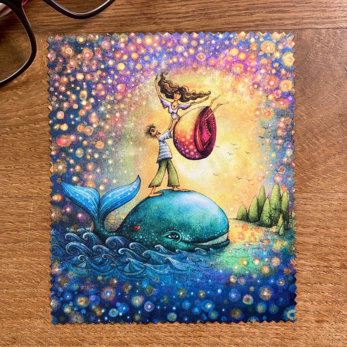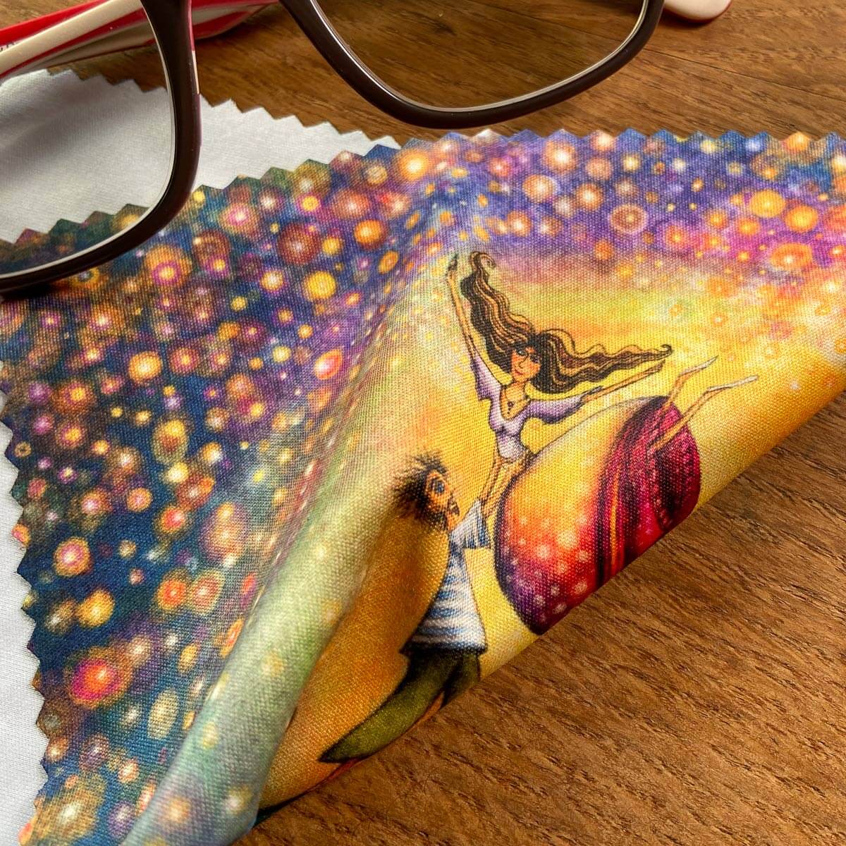 Praktický hadřík na čištění brýlí s autorským motivem.