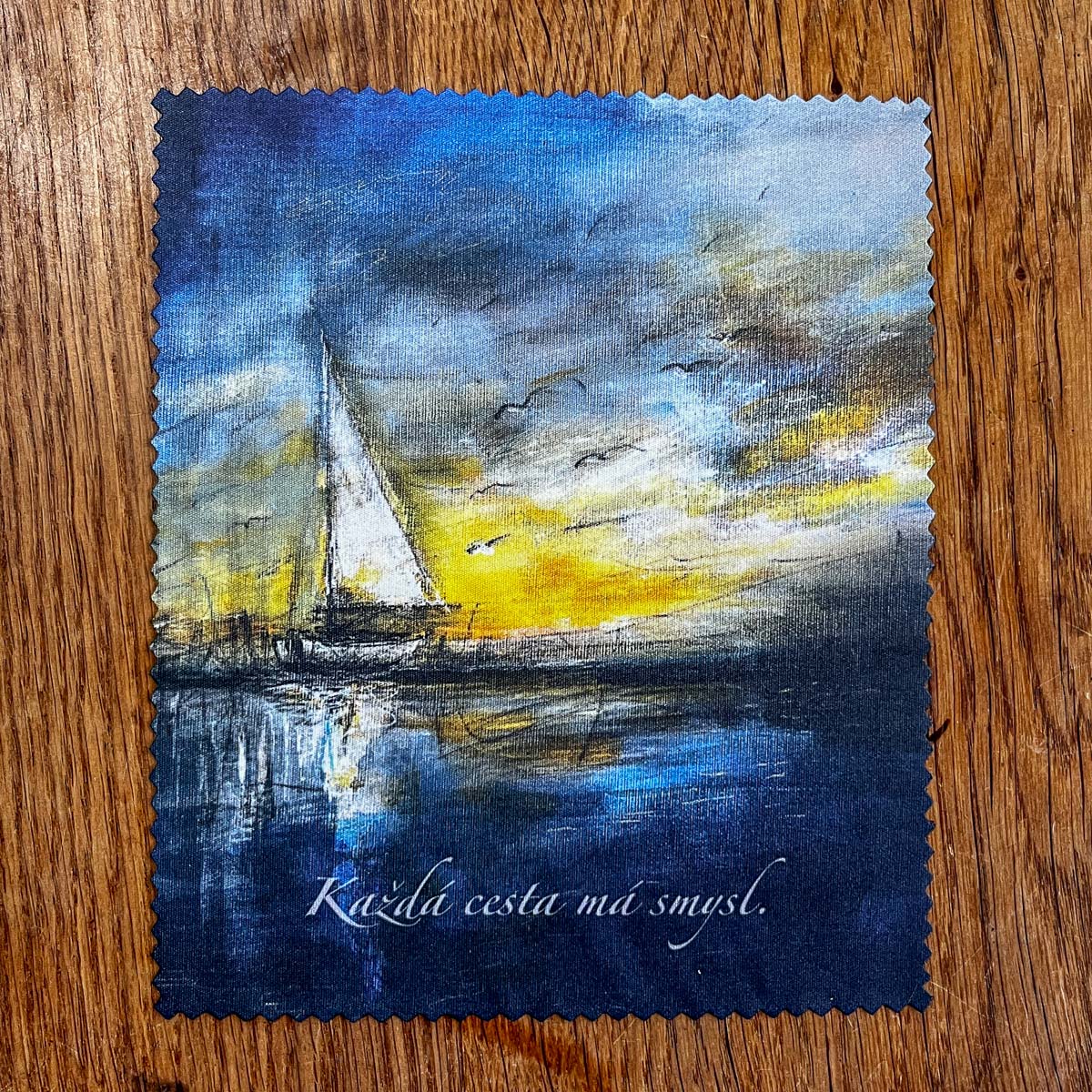 Praktický hadřík na čištění brýlí s autorským motivem.