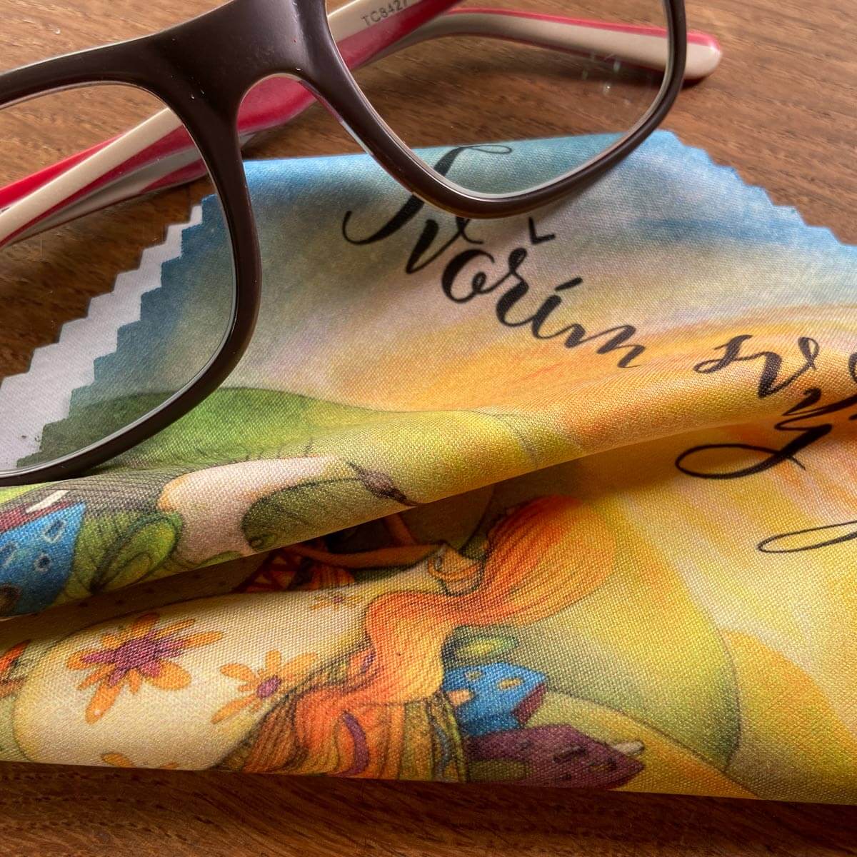 Praktický hadřík na čištění brýlí s autorským motivem.