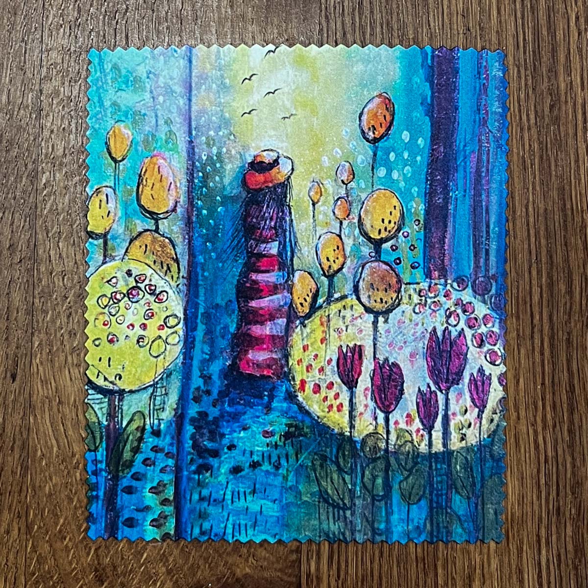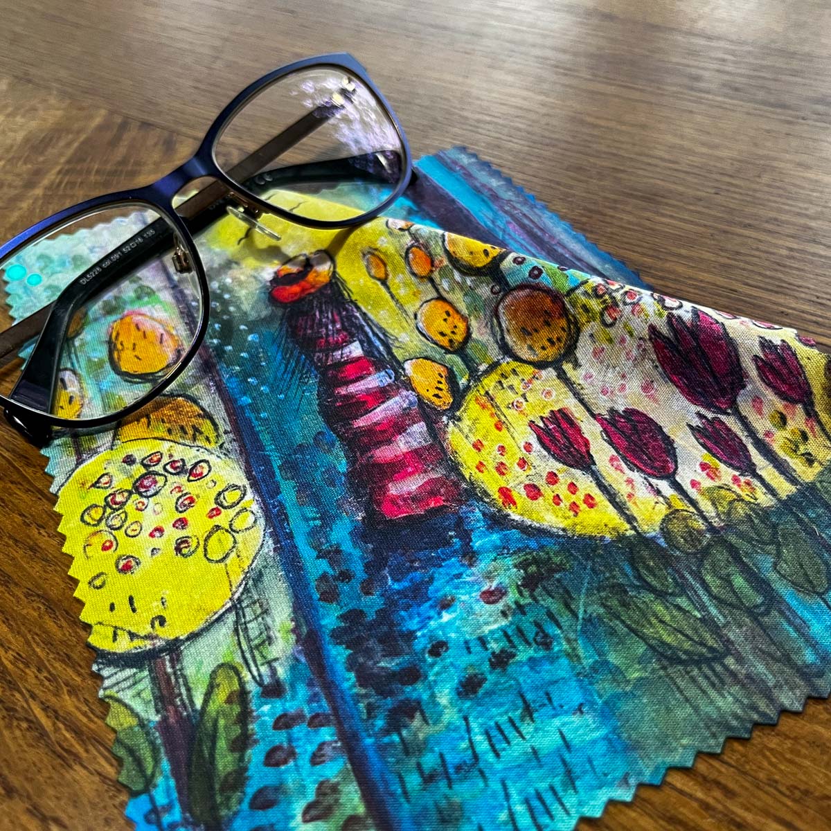 Praktický hadřík na čištění brýlí s autorským motivem.