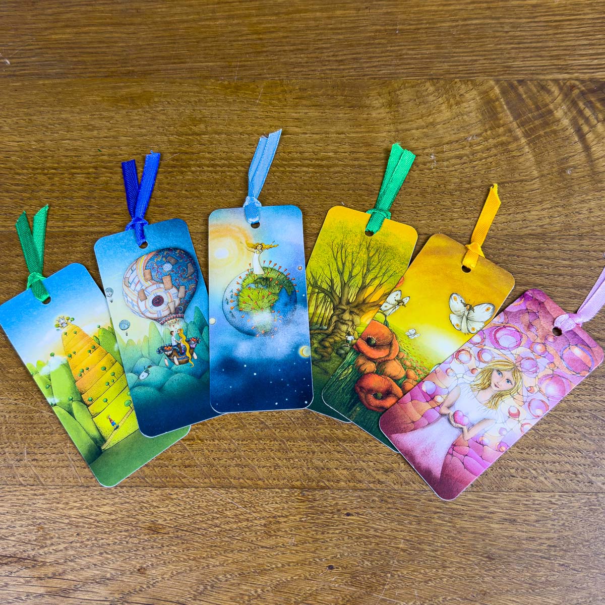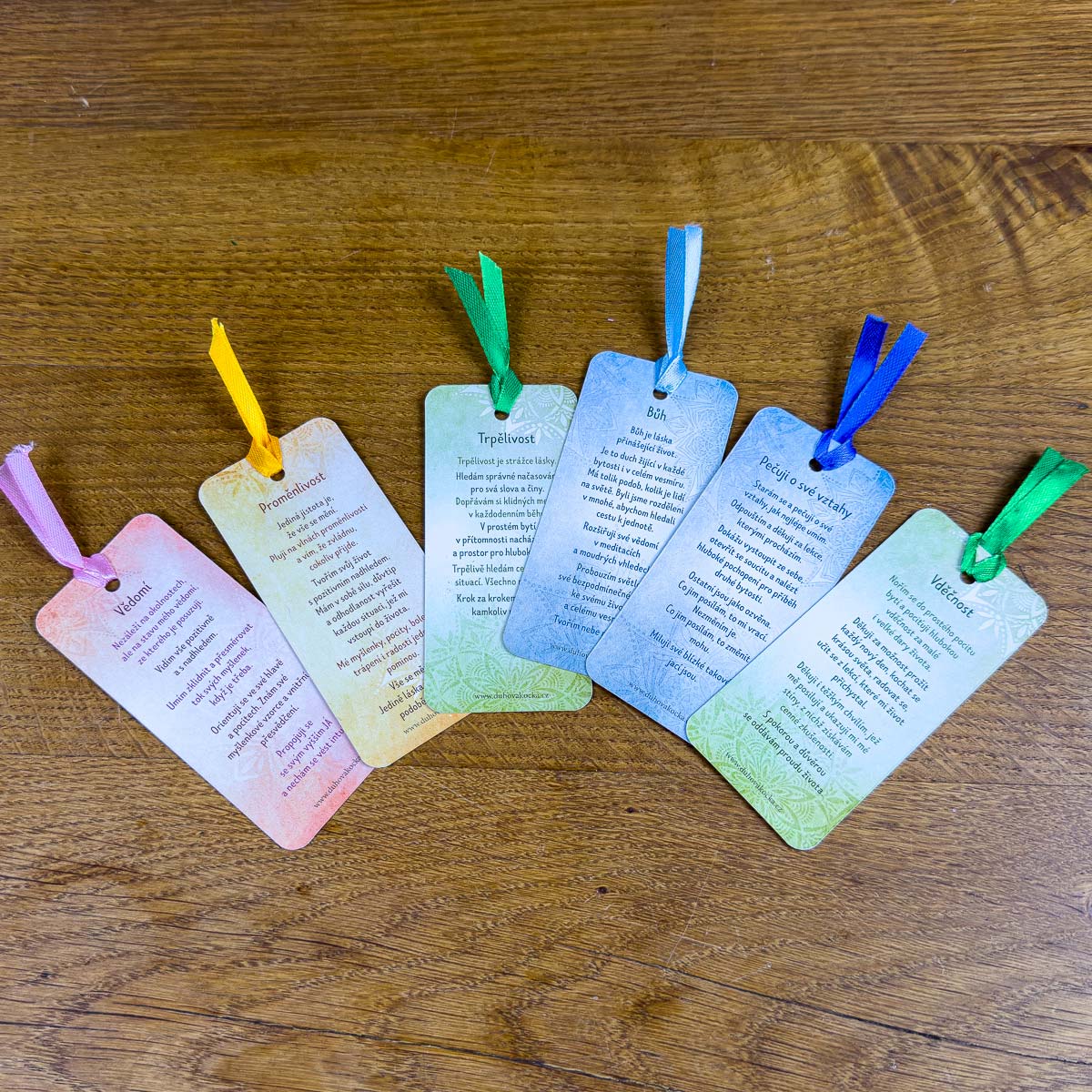 Sada praktických záložek do knihy nebo do deníčku. Záložky mají na jedné straně obrázek a na druhé straně inspirační text. Na horním konci každé záložky je uvázána praktická saténová stužka.