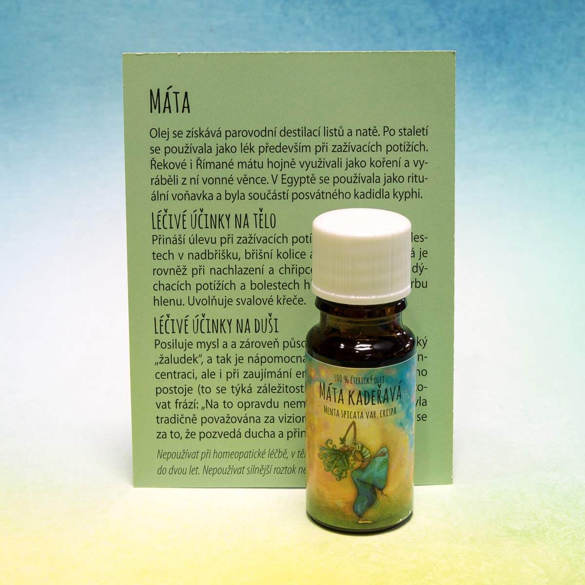 Olej se získává parovodní destilací listů a natě. Po staletí se používala jako lék především při zažívacích potížích. Řekové i Římané mátu hojně využívali jako koření a vyráběli z ní vonné věnce. V Egyptě se používala jako rituální voňavka a byla součástí posvátného kadidla kyphi.