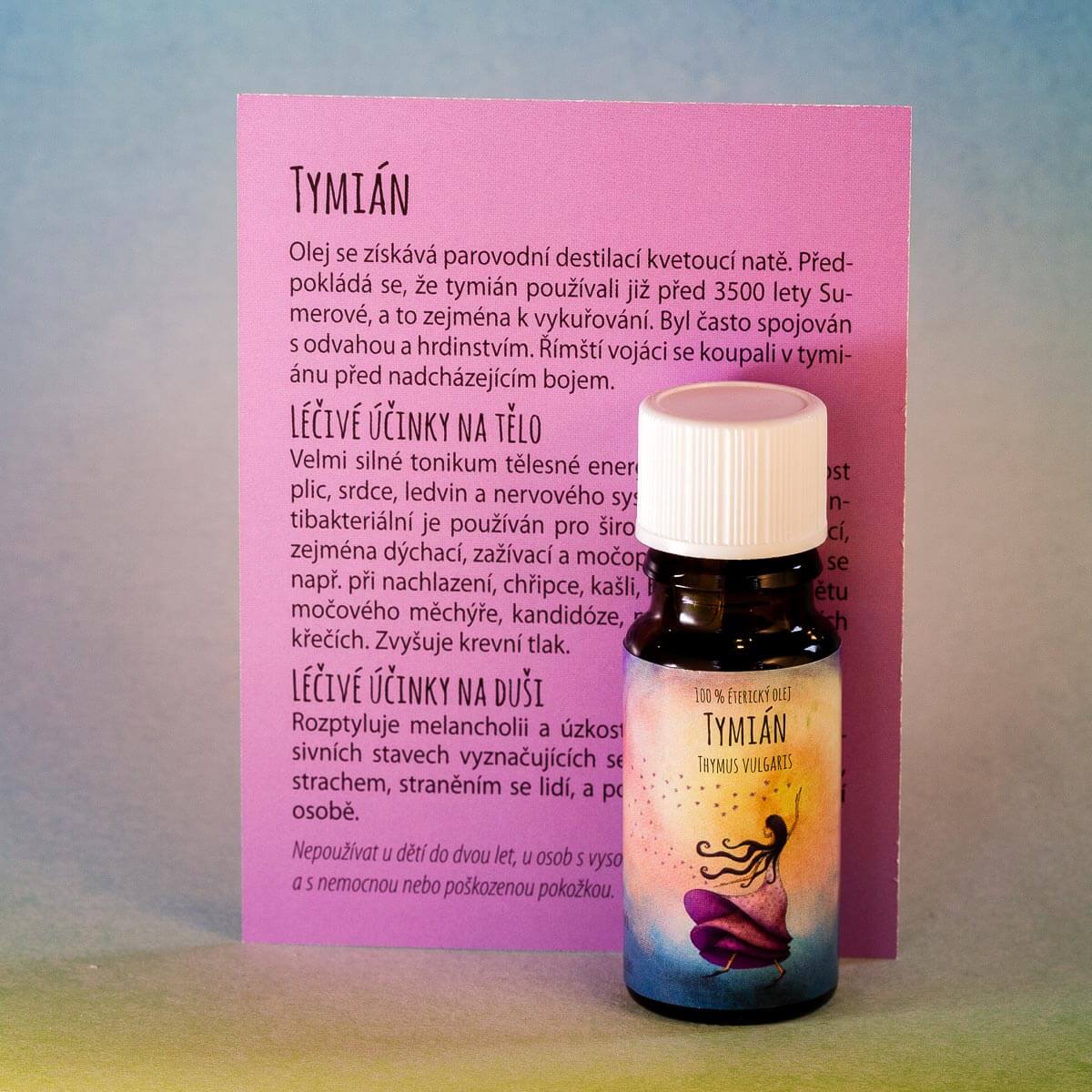 Olej se získává parovodní destilací kvetoucí natě. Předpokládá se, že tymián používali již před 3500 lety Sumerové, a to zejména k vykuřování. Byl často spojován s odvahou a hrdinstvím. Římští vojáci se koupali v tymiánu před nadcházejícím bojem.