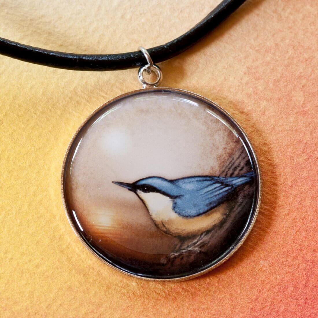 Náhrdelník tvořený kovovým lůžkem průměru 32 mm a čočkou z křišťálové pryskyřice. Čočka s obrázkem má průměr 30 mm. Přívěsek je zavěšený na kožené kulaté šňůrce o průměru 3 mm, s nastavitelnou délkou.
