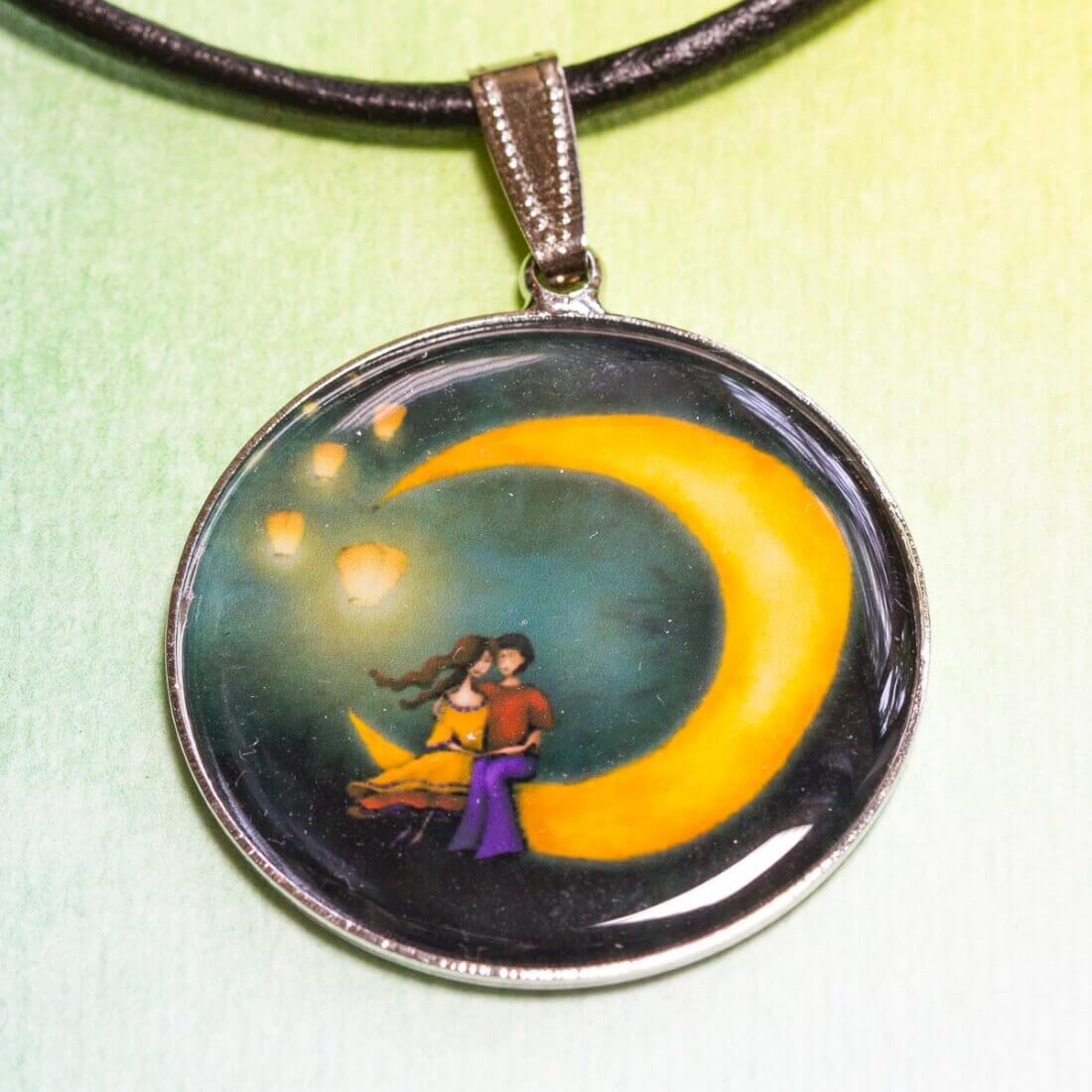 Přívěsek je tvořen kovovým lůžkem průměru 32 mm a čočkou z křišťálové pryskyřice. Čočka s obrázkem má průměr 30 mm. Přívěsek je zavěšený na kožené kulaté šňůrce o průměru 3 mm, s nastavitelnou délkou.