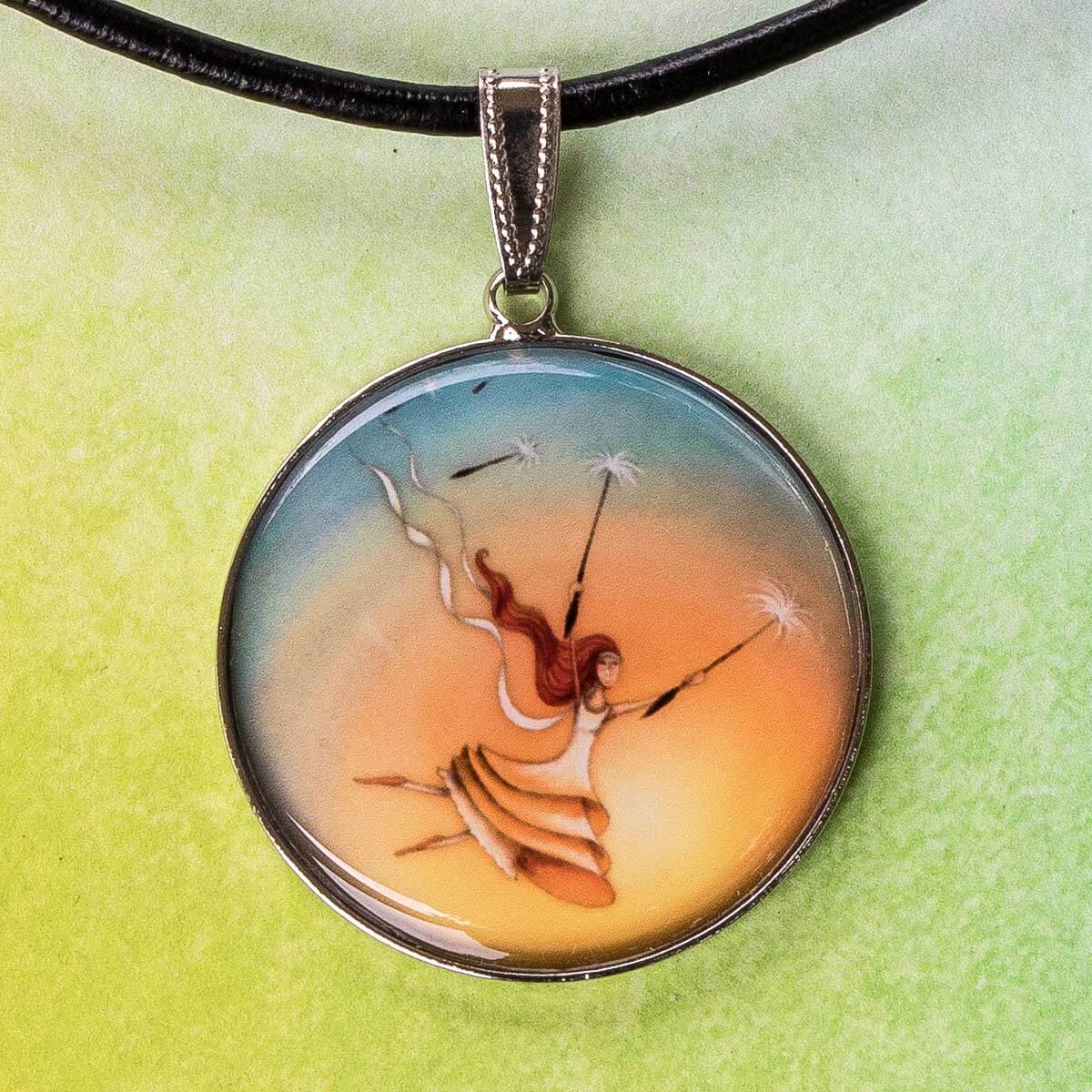 Přívěsek je tvořen kovovým lůžkem průměru 32 mm a čočkou z křišťálové pryskyřice. Čočka s obrázkem má průměr 30 mm. Přívěsek je zavěšený na kožené kulaté šňůrce o průměru 3 mm, s nastavitelnou délkou.