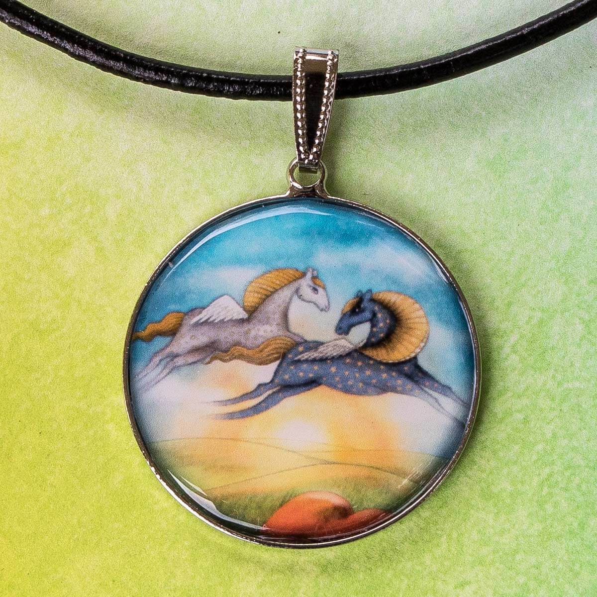 Přívěsek je tvořen kovovým lůžkem průměru 32 mm a čočkou z křišťálové pryskyřice. Čočka s obrázkem má průměr 30 mm. Přívěsek je zavěšený na kožené kulaté šňůrce o průměru 3 mm, s nastavitelnou délkou.