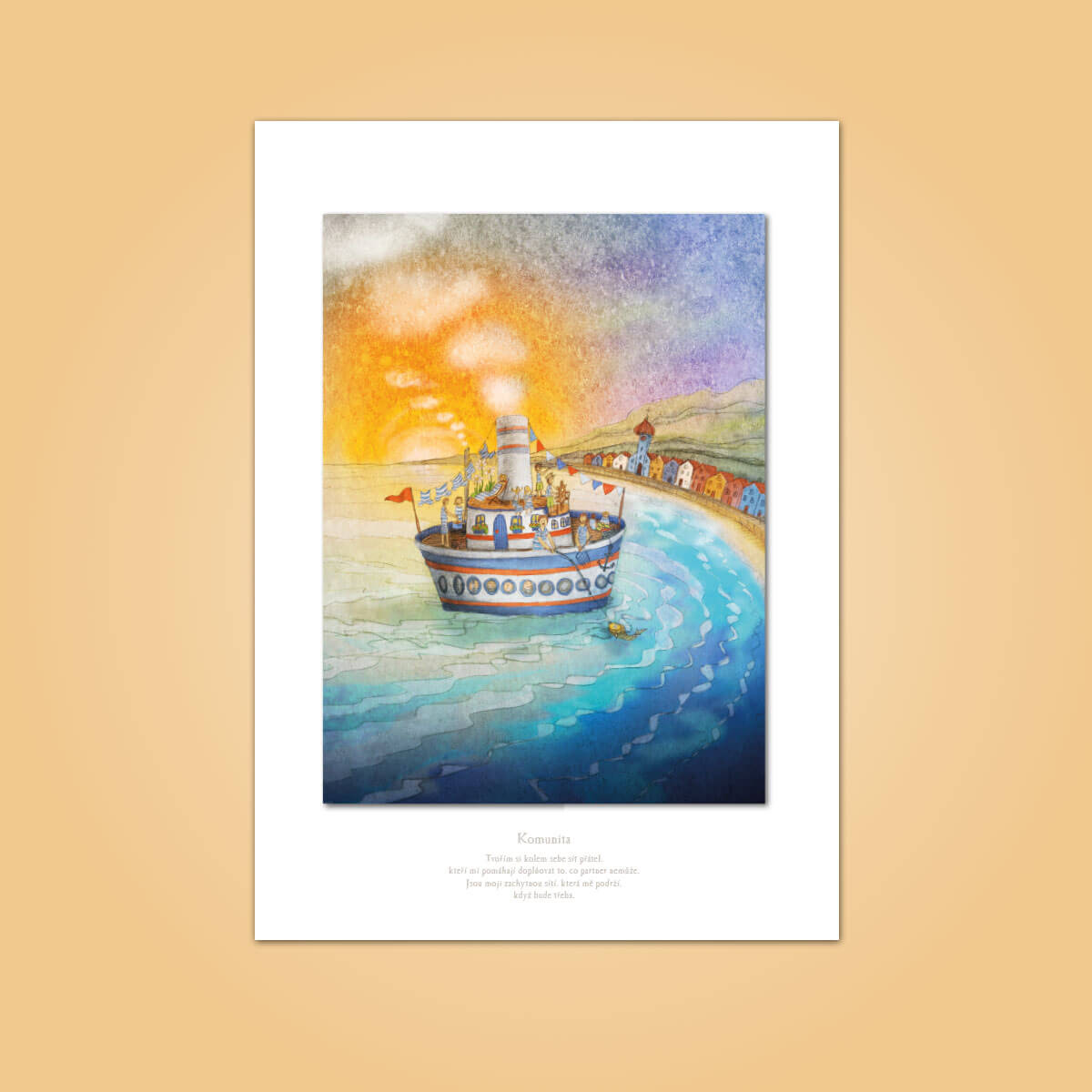 - Obrázek bez rámečku: Samostatná reprodukce s inspiračním textem vytištěným v dolní části bílé pasparty. Dostupné formáty (včetně bílého okraje): A4 (21 x 29,7 cm), A3 (29,7 x 42 cm) a A2 (42 x 59,4 cm)