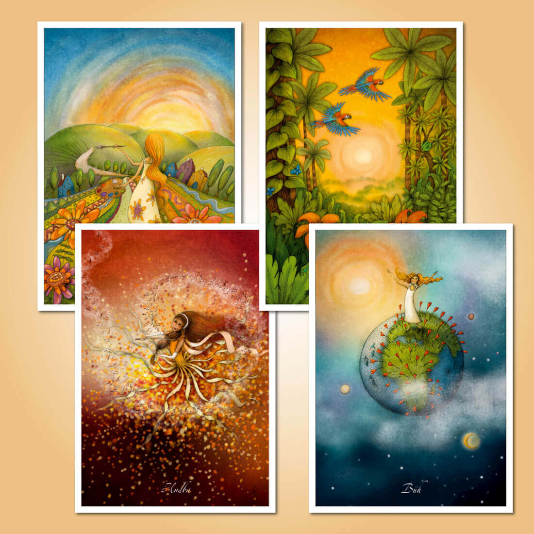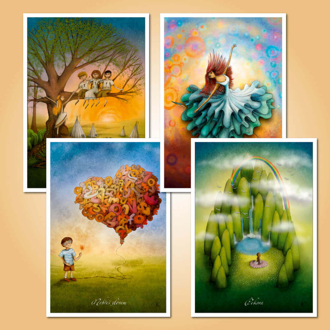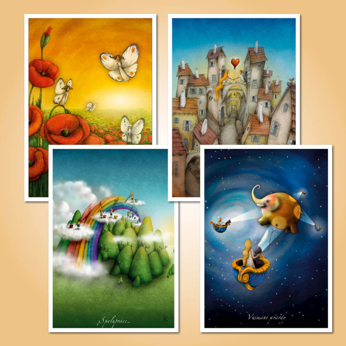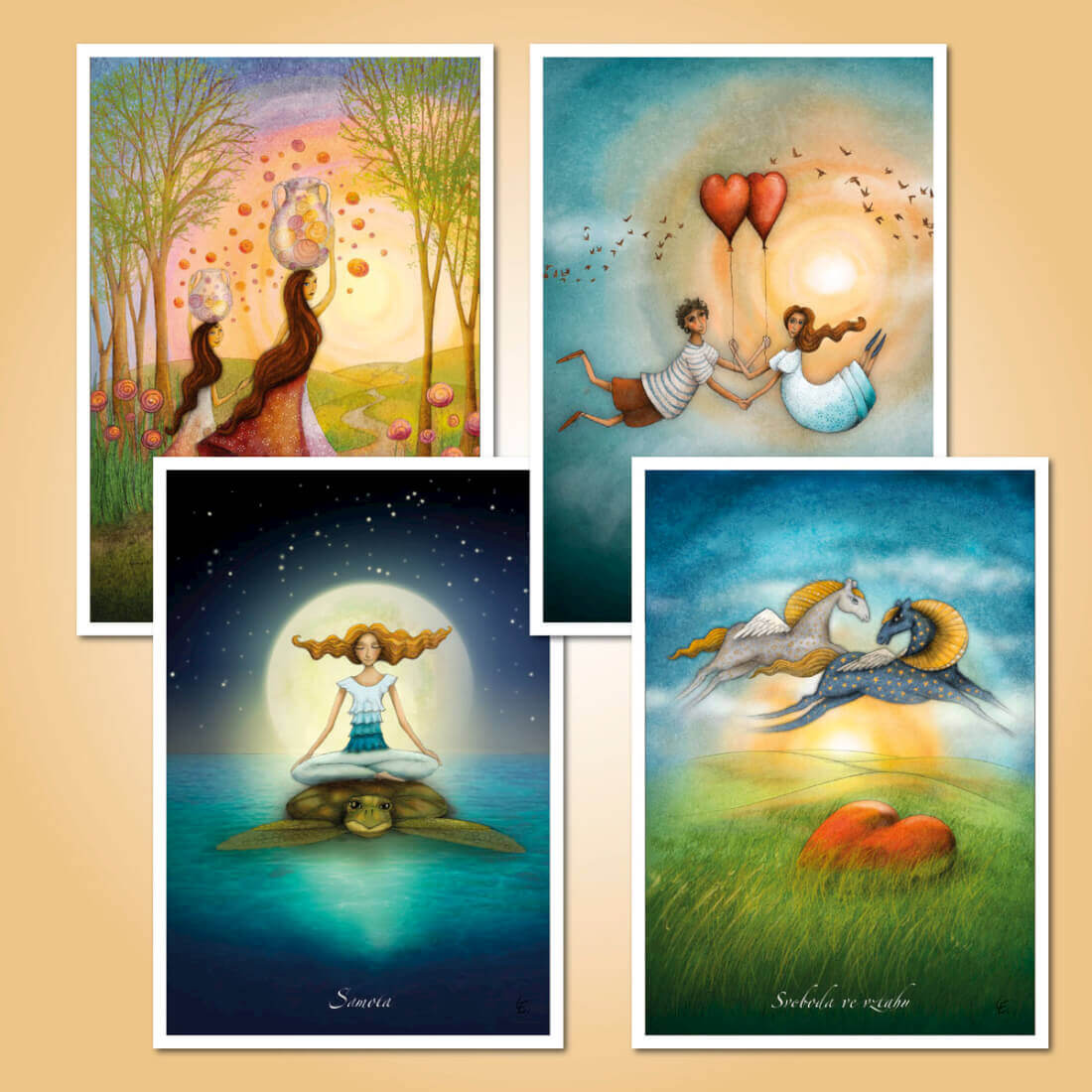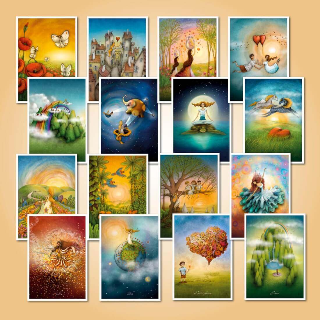 16 ks pohlednic vytvořených z vybraných ilustrací k mému projektu inspiračních karet Cesta životem.