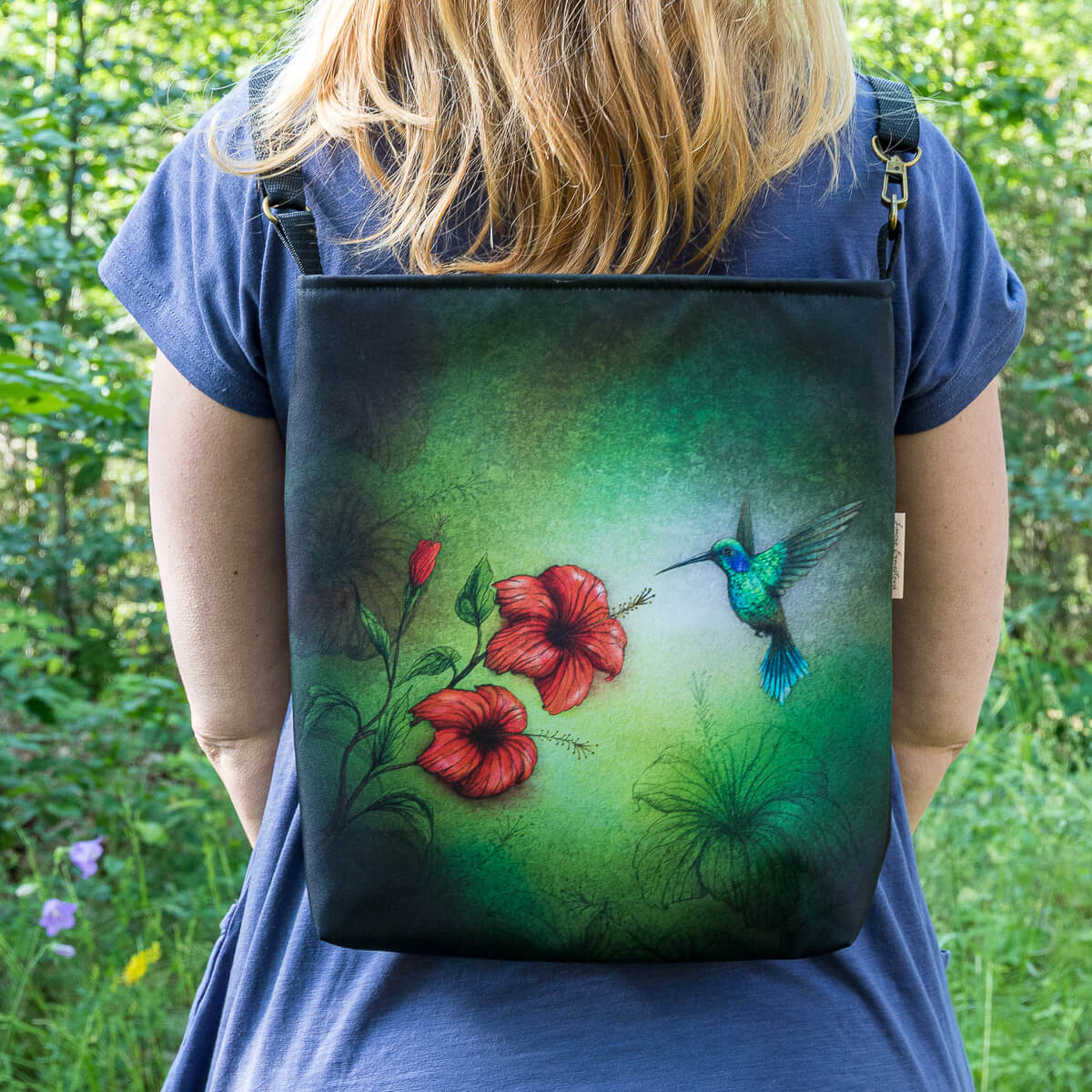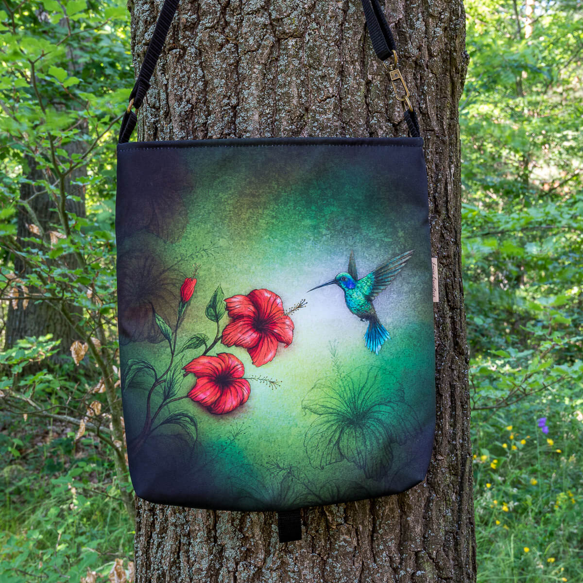 Propracovaná taška přes rameno s elegantním obrázkem pro každodenní radostné nošení. Vejde se do ní pohodlně blok nebo časopis velikosti A4. Ramenní popruh má nastavitelnou délku a je na jedné straně připevněn karabinou. Jednoduchým protažením ramenního popruhu očkem na dolní straně vytvoříte z tašky malý baťůžek. Je vyztužená, aby držela tvar a obrázek se nedeformoval. Uvnitř je vypodšívkováná a najdete zde menší kapsu na drobnosti a malou kapsu na zip na tajnosti. Jezdec zipu je ozdoben přívěškem s motivem obrázku na tašce.