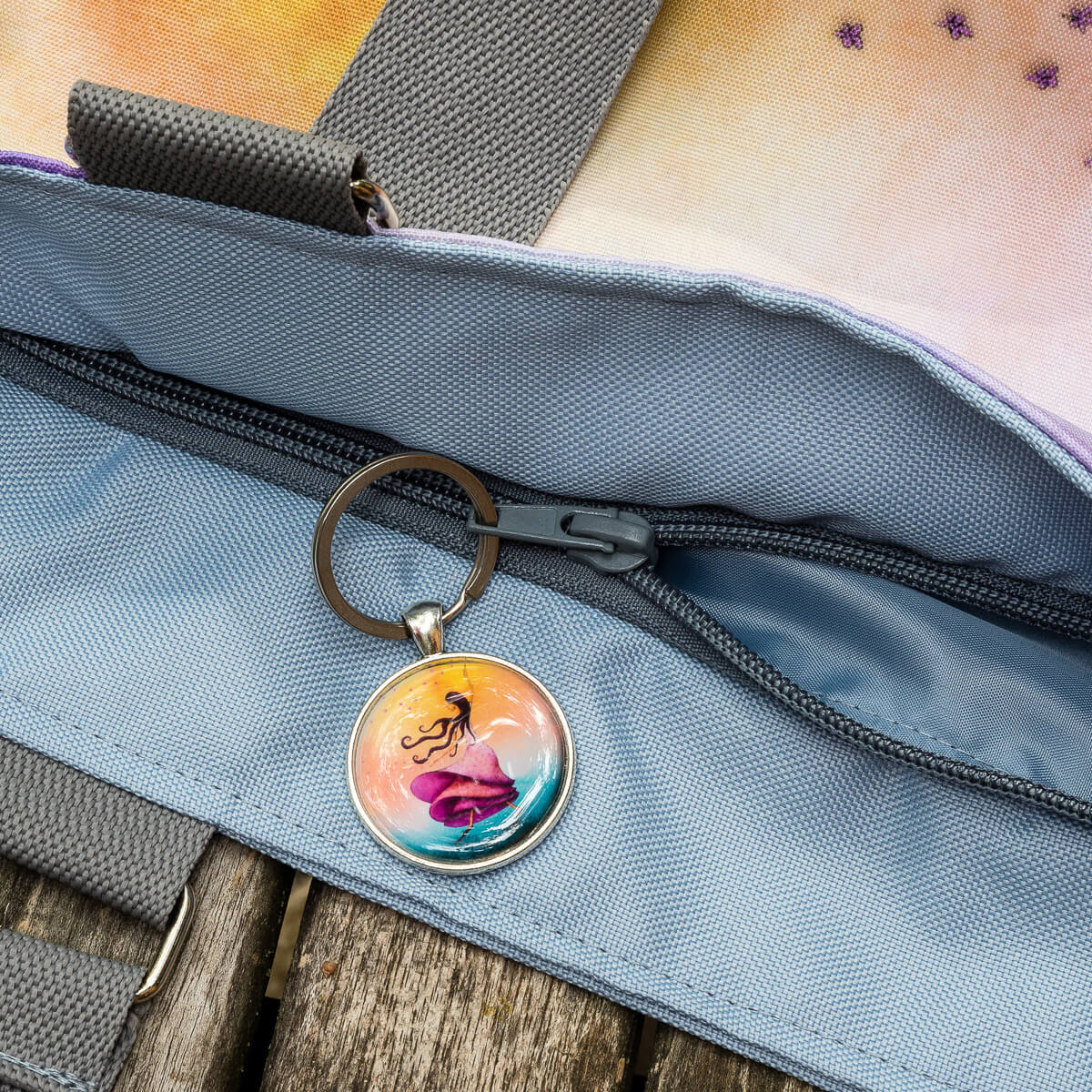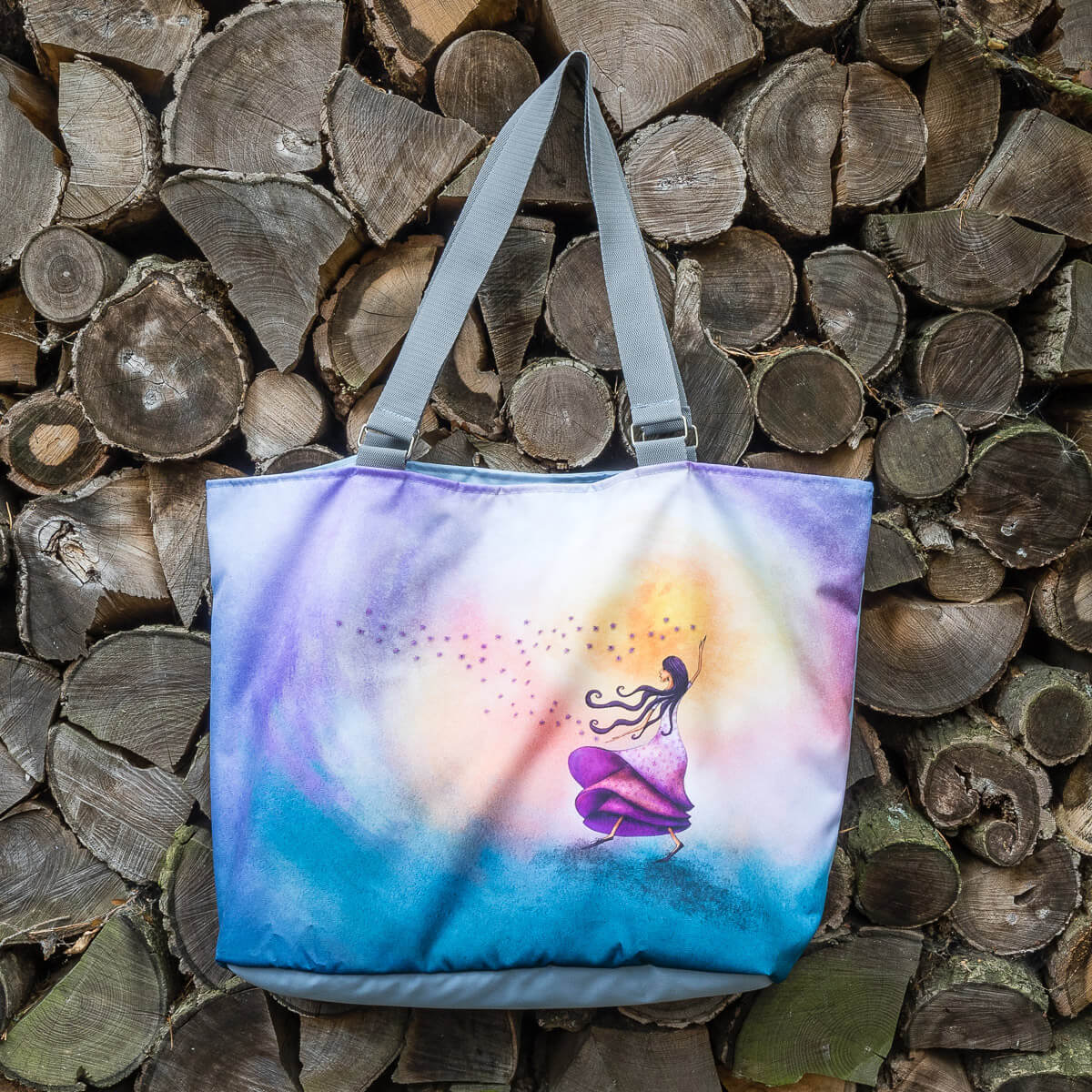 Shora je uzavřena kovovým zipem s nádherným přívěškem. Ten je tvořen kovovým lůžkem do kterého je zasazena zmenšenina obrázku na tašce. Popruhy jsou pevné a vše je uděláno tak, aby taška unesla i velký nákup a přitom neztratila svoji eleganci.