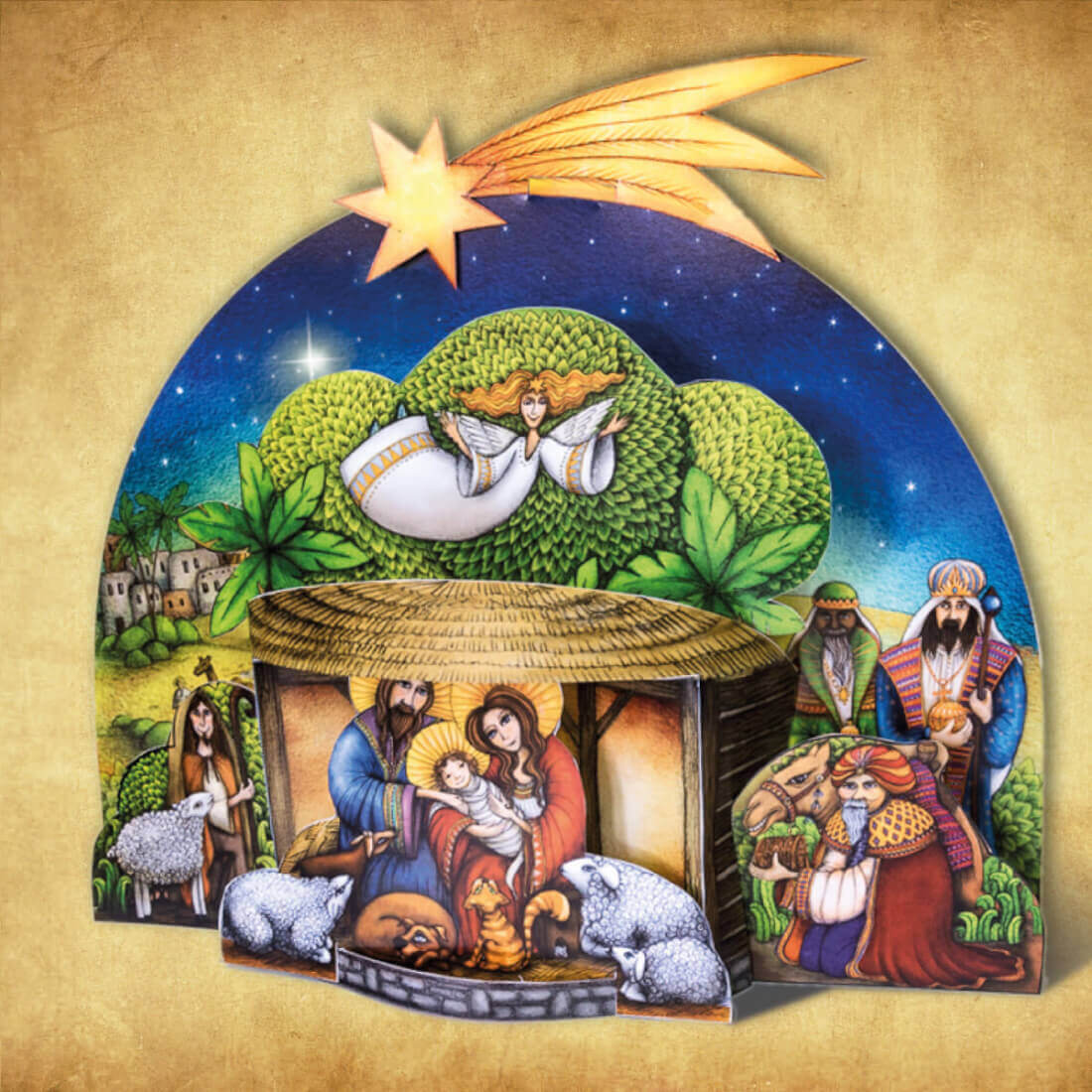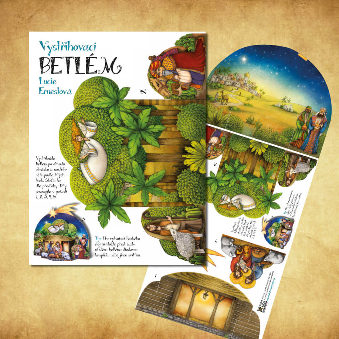 Vystřihněte si a složte parádní originální autorský vánoční betlém, který krásně doplní vaši vánoční výzdobu. Prostorová stabilní skládačka s pozadím betlémské krajiny, třemi králi a Ježíškem ve vřelém objetí své rodiny jistě potěší i jako malý dárek. Pro vytvoření hezkého dojmu vložte před zadní stěnu diodovou lampičku nebo jinou svítilnu. Hodí se do betlému zakomponovat i část vašich svíticích řetězů.