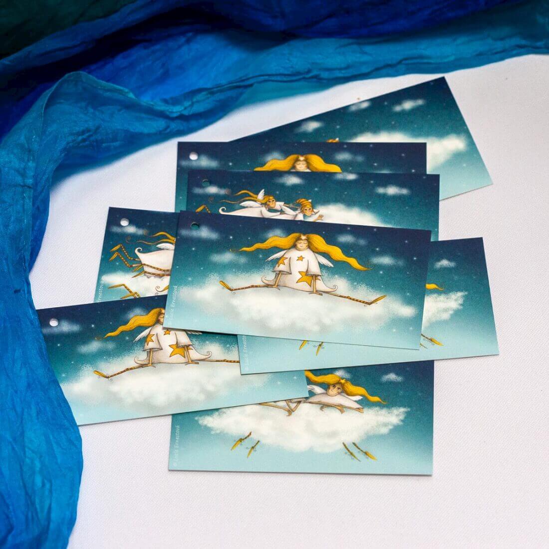 Visačky jsou vytištěny na silném matném křídovém papíře gramáže 300 g. Každá kartička má velikost 5 x 9 cm a v rohu má dírku na provlečení mašle. Jméno vepíšete do bílého obláčku.