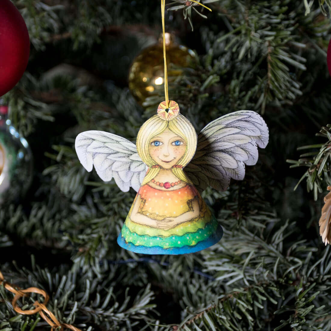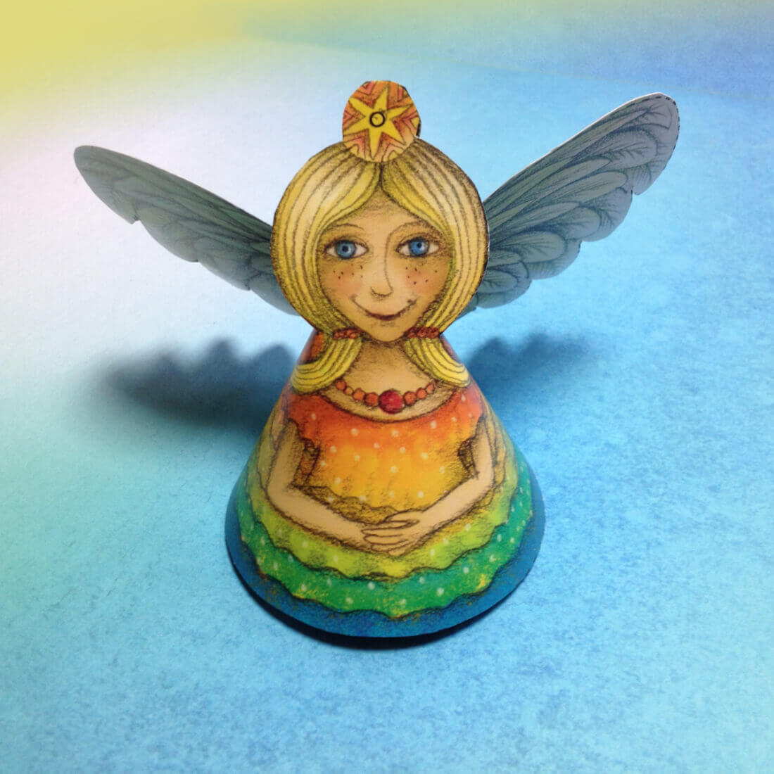 Milá vystřihovánka Andělka Duhovka, kterou můžete pověsit na stromeček, postavit na stůl nebo z ní vytvořit květinové zapichovátko.