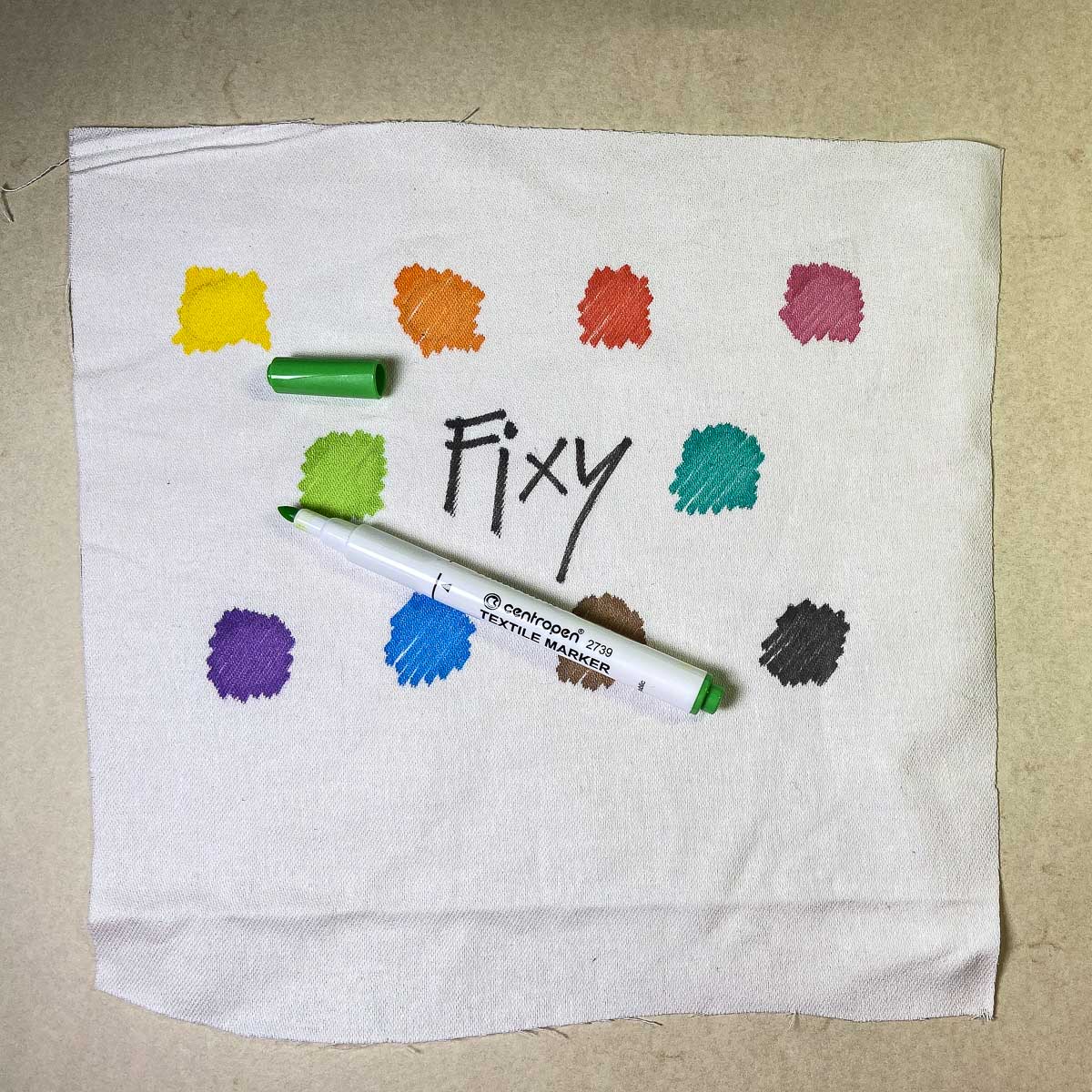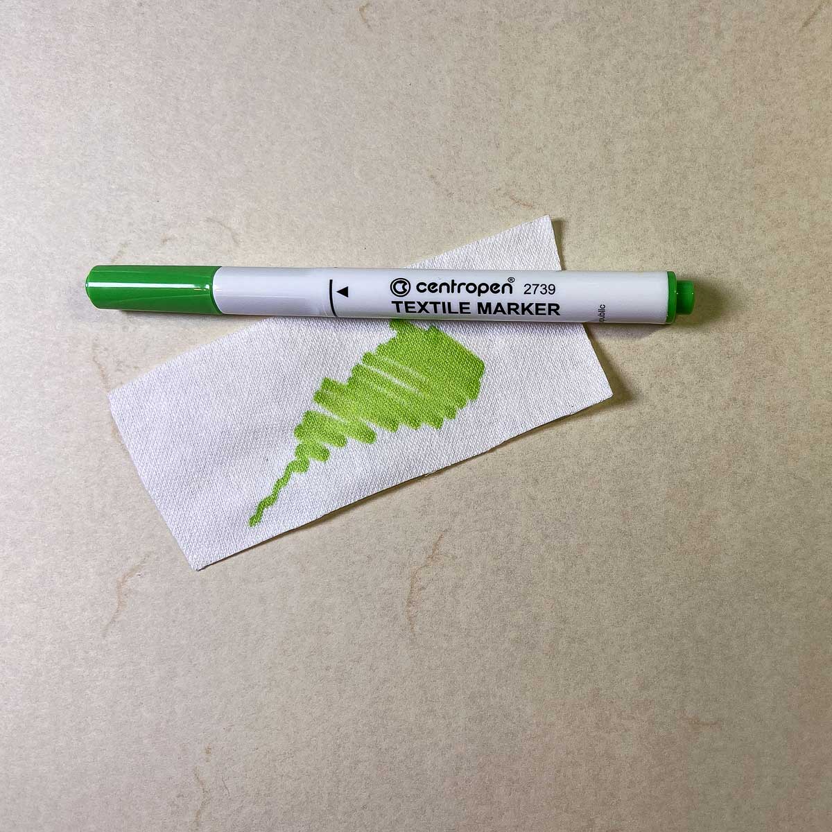 Světle zelený fix na textil od značky Centropen. Nemusí se zažehlovat a má odolnost při praní do 60°C. Má hrot o průměru 3,9 mm, ale s jeho špičkou zvládnete i čáry mnohem tenčí.