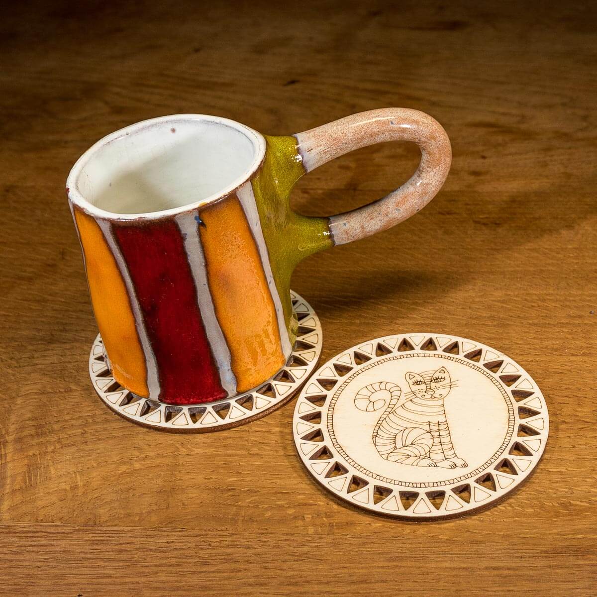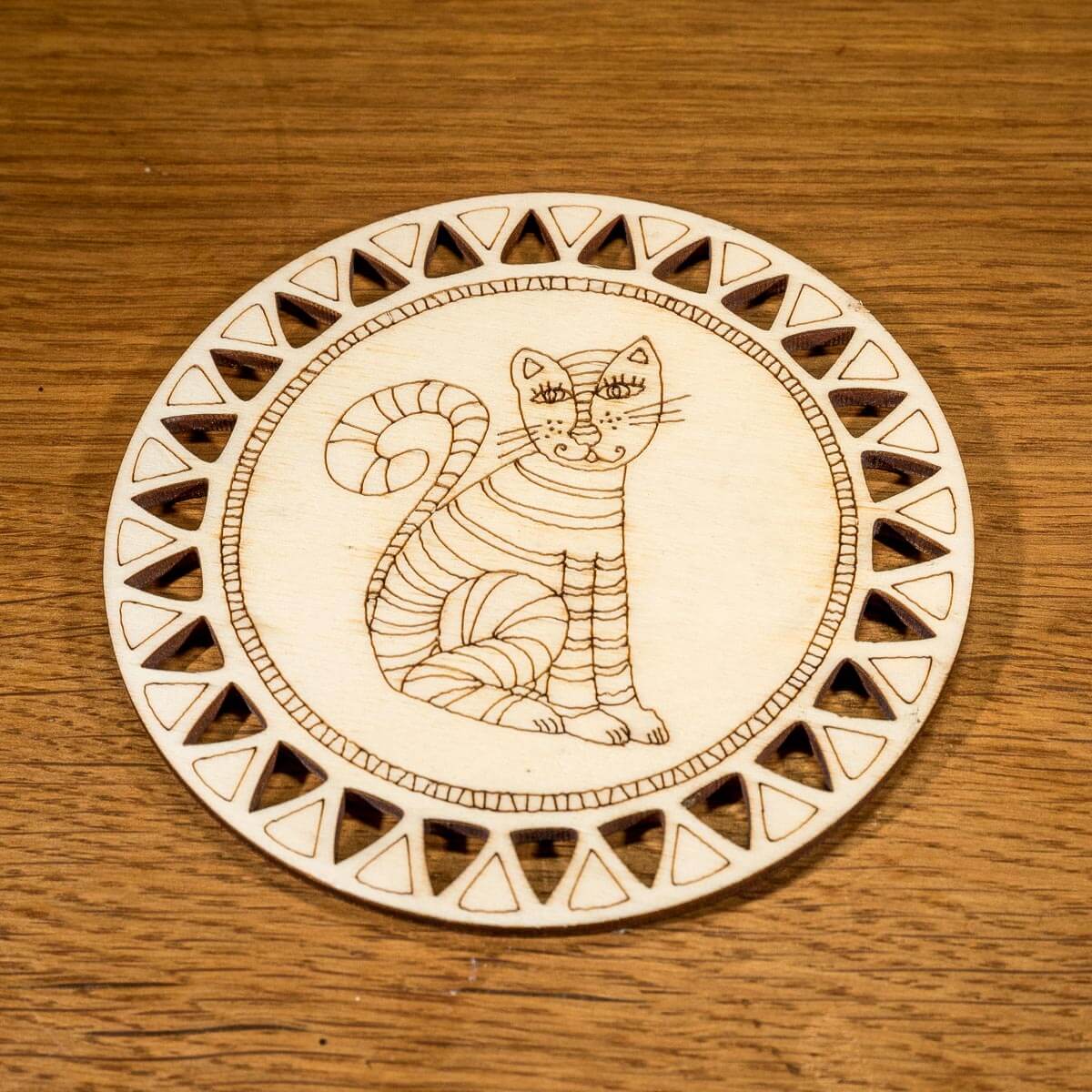 Sada 2 kusů tenkých překližkových podložek pod hrneček s gravírovaným motivem kočky.