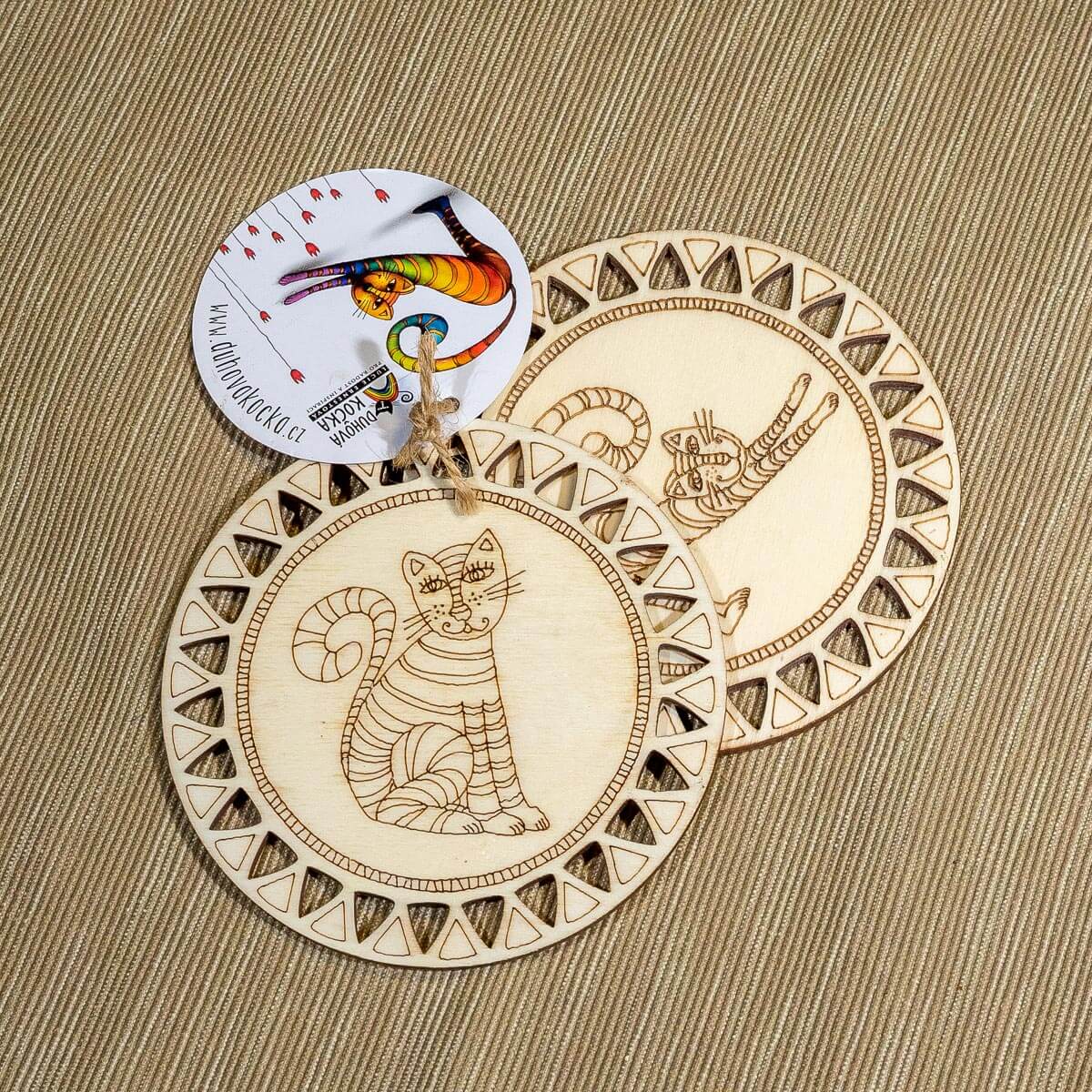 2025-04-19 pond: 2025-04-21 *** 2025-04-18Sada 2 kusů tenkých překližkových podložek pod hrneček s gravírovaným motivem kočky.