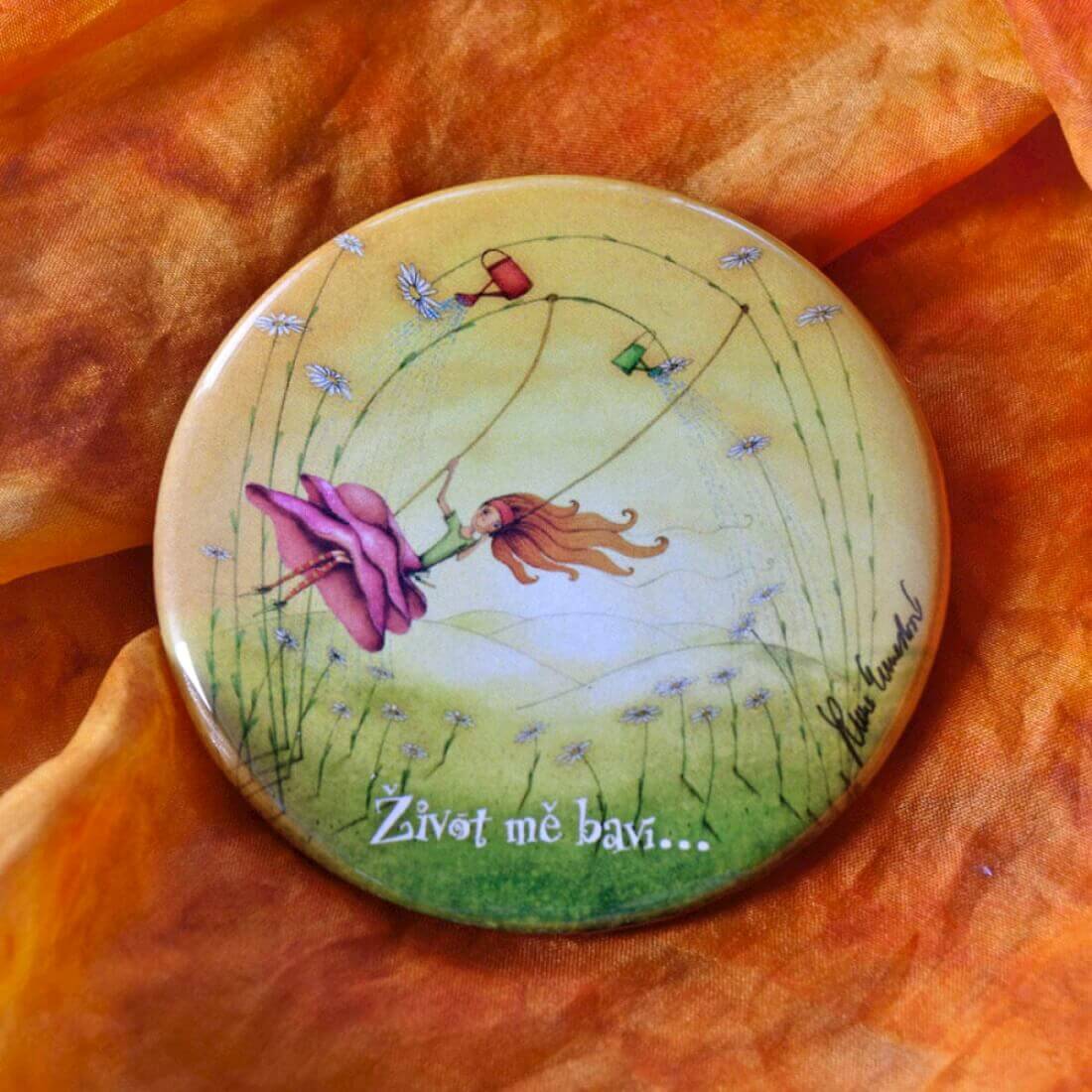 Originální jednoduché zrcátko o průměru 5,6 cm. Z jedné strany je autorský obrázek krytý odolnou fólií, z druhé strany je vsazené skleněné zrcátko.